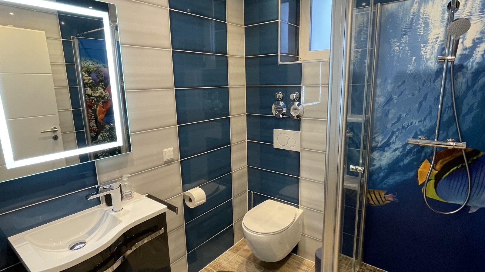 - Badezimmer mit WC und Waschtisch, begehbarer Dusche,