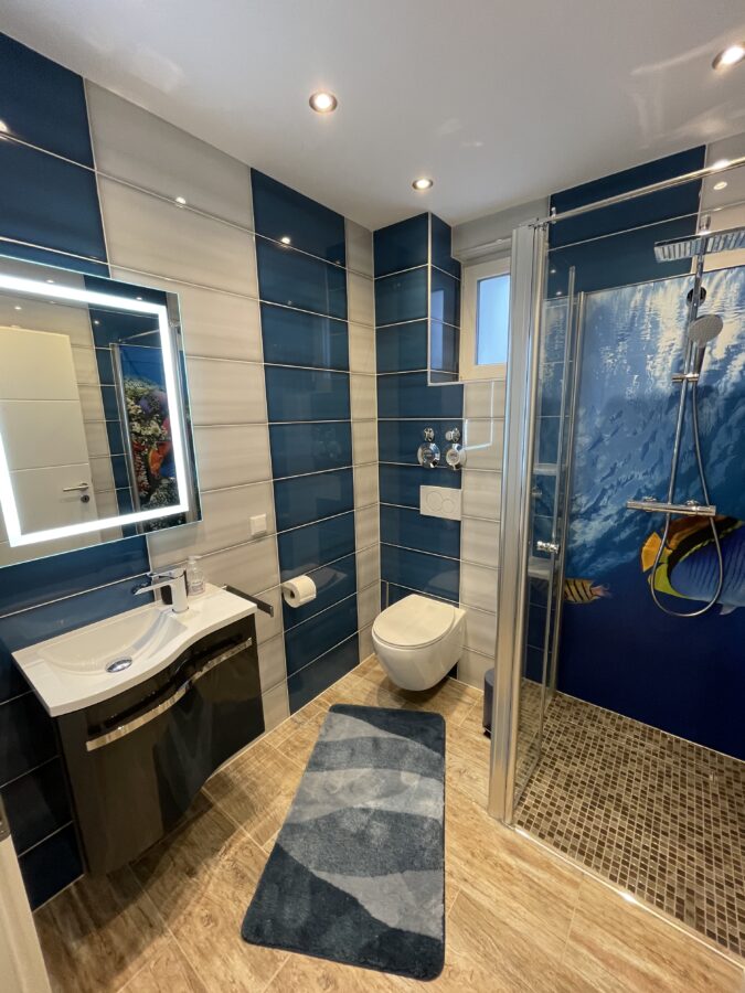 - Badezimmer mit WC und Waschtisch, begehbarer Dusche,